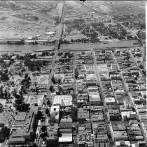 Sacramento, Aerial photograph, looking west from about 10th street and L street. The Tower street bridge and the Sacramento River are in the back ground.