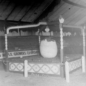 Photo--black and white, from Borba celluloid negative: Gravenstein Apple Show display by the Petaluma Chamber of Commerce with a huge opened egg filled with apples. The four posts are made to look like eggs stacked on top of each other. In the background the Gravenstein Apple Growers Co-Operative display is seen. Hand scratched at the bottom center is "Borba Photo."