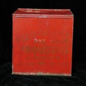 Red tin with faded gold lettering. "Feldhusen's Mail Order Provisions Sacramento."