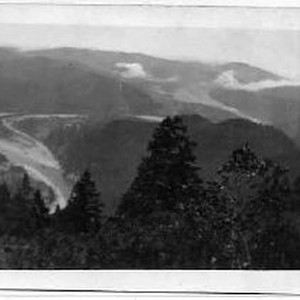 Photographs of Yurok Indians at Requa, California. Part of California Historic Landmarks and Missions folder (82/078/1632). Postcard, "Klamath River above Requa - under fog."