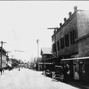 Photo--black and white: Bodega Avenue looking east about 1900. To the middle left is the Bank of Sonoma County, a stone block building (known as the Kingsbery Building) which sits on the corner of Main and Bodega Avenue. he brick building on the right has an "Analy Standard" sign (next to buggy) and Bargin Second Hand Store is to the near right. A "Celebration" banner is seen in the far background.