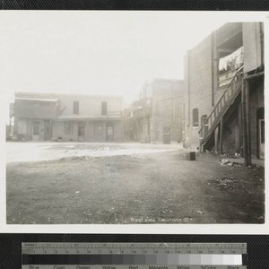 View of the backs of two-story brick buildings, some with balconies and drying laundry, and a dirt lot on Cayetano Street in Old Chinatown, Los Angeles. Title transcribed from photograph.