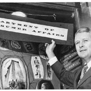 Caption reads: "Same office--New Name. At a ceremony conducted in the Capitol, Leighton Hatch, director of the State Department of Professional and Vocational standards, tore down the old and put up the new--a sign proclaiming the new name of the government office as the Department of Consumer Affairs."