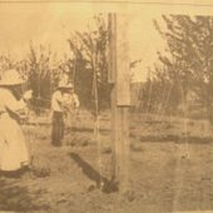 Photo--black and white:Tsune Matsuda, left, and her husband Taichi, far right, were laborers on the Woodworth hop and pear ranch near Fulton, about 1915. Taichi immigrated to California in 1908 via Hawaii, from Japan and Tsune followed five years later.