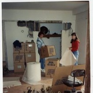 Staff packing up the artifacts from apartment #27 from the Merrium Apartments for transfer to the archives.