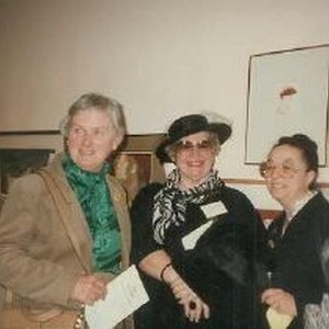 Three women pose for the photographer. Florence Burt is in the center. On the wall behind them are framed paintings. The photograph is glued to a piece of paper. Next to the photograph is written: "Vicki Lasvorini, Ann Bousino, Boston 1986." Photograph removed from file folder, National Organization of the NLAPW, 2003/051/027.