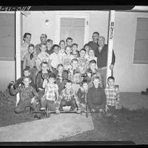 SERIES -Two views of an unidentified group of boys and several adults posed in front of a house with the number 1705 on the porch post. On the ground in front of the boys is a large dumbbell weight. Original container marked "Est Yolo Record"
