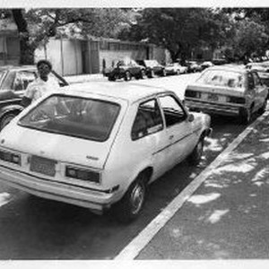 Image of a woman getting into a white hatchback car parked in front of the The Sacramento Bee building during 1984-85 typographical union strike.
