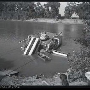 Gas truck off river ferry at Elkhorn ferry. Shows ferry with car and gas truck partially in water. 2 small boats tied alongside.. 7/28/49 3 of 4