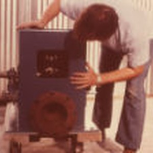 Person examines machinery.