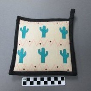 Hot pad of cotton blend fabric; off-white background with applique of cactus plants and a zig-zag design in pink. and black edging. Original sales tag on back "Cacatus Bone PH W.C. Designs"