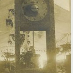 Postcard--black and white photo--The 1913 Gravenstein Apple Show display of a pendulum clock made of whole and dried apples. The clockface shows the town name "Graton" who sponsored the display.