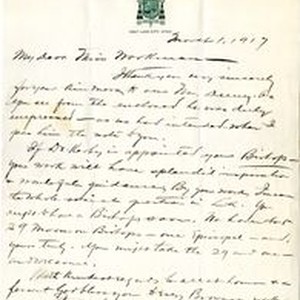 A hand written letter to Mary J. Workman from Fr. Joseph Glass, dated March 1, 1917. The letter mentions William Deeney and his reaction to an earlier note sent by Mary J. Workman.