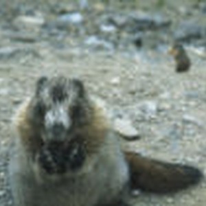 A hoary marmot sitting on the ground along Logan Pass while a Columbian ground squirrel sits in the background.