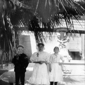Melvin Joslyn, Isobel Joslyn, and Elsie Hodson pose in front of fountain at the Sacramento County Courthouse.