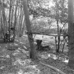 Two men seated at picnic table in forest. Firepit and drying rack in foreground.