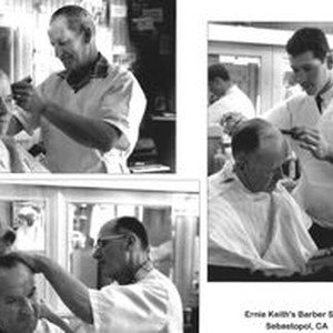 Photo--black and white: Barbers working in Ernie Keith's Barber Shop in Sebastopol. Barber upper left corner Ernie Keith and the barber on the right is Bill Roventini. The third barber is unidentified. Taken April 1961.