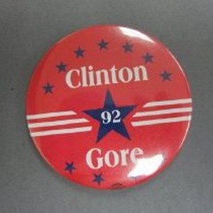White text on red background w/white stripes and blue stars. "Clinton Gore '92"