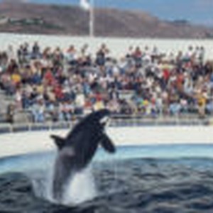 Female killer whale performing for a crowd of people in stands at the now defunct Marineland themepark.