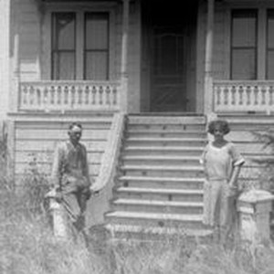 Photo--black and white, from Borba 8" x 10" celluloid negative: A man and woman posing at the steps of a house. The man is standing a wearing overalls and the woman is opposite at the bottom of the steps. Circa 1920-30.