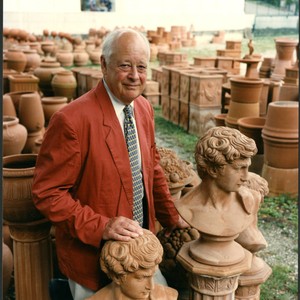 Color photo of Charles Handy outside near sculpture, taken by Elizabeth Handy. Charles appears resting his hands on the artworks. He is gazing directly into the camera lens.