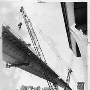 Caption reads: "Engineers rigged a huge crane aboard a barge to support the three-lane west-bound span on the Bryte Bend Bridge being built across the Sacramento River from Sacramento to Bryte after a steel I-beam, 2 1/2 feet wide and 2 1/2 inches thick cracked Saturday, forcing the closure of California 16, which runs under the span. State engineers are seeking to determine the cause."