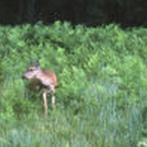 Female deer looking to its right standing amid green vegetation in Cook's Meadow.