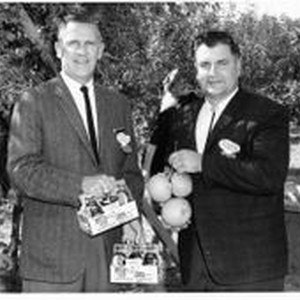 Photo--black and white: Don Hallberg, right, of O. A. Hallberg & Sons apple products and Paul LeBaron of Clyde LeBaron Co. Both holding Hallberg apples and apple juice. about 1960s.