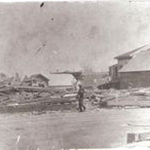 Black & white photo of 1906 Earthquake damage--Barnes Block on Main Street Sebastopol (Ronsheimer's Store, Berry& Phillips Barber Shop and Borba Cigar Stand -Joseph Borba)
