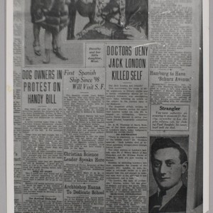 A photograph of a newspaper clipping from the San Francisco call addressing an article by C. Hartley Grattan that appeared in the journal Bookman, which asserted that Jack London committed suicide. One of the three doctors who was present at London's death is quoted vehemently denying Grattan's claim.