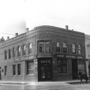 View of the First National Bank building from across the street. Horse and wagon in street. Possibly not in Sacramento.