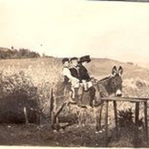 Photo--black and white: Three children riding a mule on edge of a fiesta-early 1900s.
