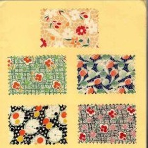 Cotton print textile samples; "Season 1934 100-A Vat Prints" from Walton N. Moore Dry Goods Co., Inc San Francisco California; eight fabric samples in various designs glued on cardboard 9 1/2" by 13 1/2" opens to 19" wide.
