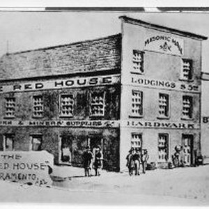 Copy Print: Exterior view of the Masonic Hall at the southwest corner of 5th and I Streets. The first Sacramento Masonic lodge was organized in the attic of "The Red House" a dry goods store in 1850.