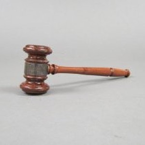President's gavel made of stained wood with metal plating in center of head. Engraved inscription on plating reads: "Presented to Sac Branch LAPW by the first president Jeanette Lawrence 4-9-27."
