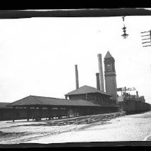 SERIES: Four views of Cape Girardeau, Missouri about 1905. This view is of the train depot in the city with its tall clock tower and also showing a streetscape.
