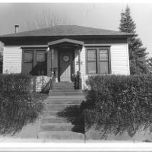 Photo, black and white: Sebastopol house at 241 Florence Avenue a Hip roof cottage with Colonial Revival details built in 1905 in the Raup Addition. House photographed in 1993 by Evelyn McClure for her book "Sebastopol, California : History, Homes and People."