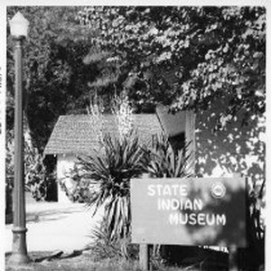 Photograph of the California State Indian Museum located on the grounds of Sutter's Fort. Building in the background with sign in foreground, plants and trees and light stanchion.