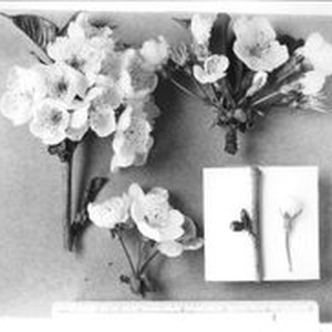 Photo--black and white: Gold Ridge Experiment Farm Burbank cherry blossoms displayed with a ruler showing size. Handwritten on back "Burbank Cherry T-2 "Lambert" Stock Tree, April 3, 1931.