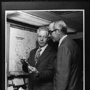 SERIES. Sacramento Police Chief Wm. J. Kinney meets with unidentified men in the communications center of police headquarters. Maps behind them.