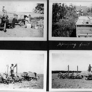 "Filling spray rig [1], spraying in orchard using wands [1], and gang of three bean planters [2]." Four photos. "Fred's orchard was at the corner of Power Line Road and Garden Highway. His grandson, Bucky Novak, has his retail orchard on that spot today, called the Lazy Oaks. Fred grew plums and peaches for commercial canning. Bucky grows a great variety of fruit for the fresh retail market."
