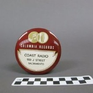 Record cleaner, velvet and plastic, 3-1/2 in diameter, "Coast Radio...Sacramento...", c.1950s