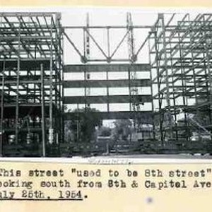 Typed on binder page "This street use dto be 8th street, Looking south from 8th & Capitol Ave. July 25th, 1954". View is of the superstructure of a state building under construction.
