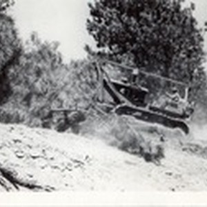 Man on bulldozer knocking over pine trees, probably at Camp Whitsett.