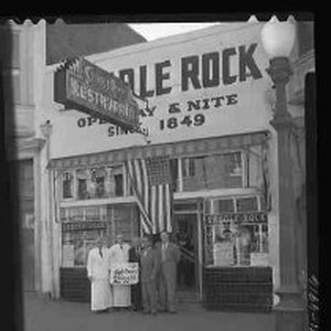 Five unidentified men standing in front of the Saddle Rock Restaurant. One is holding a sign "Eagle Aerie # 9 Pony Express Nite May 20th"