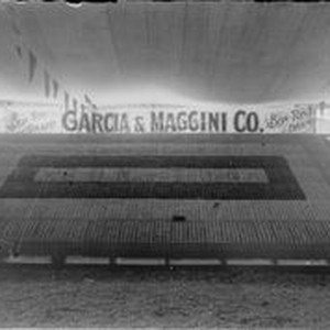 Negative glass-plate photo: From a glass plate negative made by William Borba. Gravenstein Apple Show exhibit circa 1915 in Sebastopol. Display of Garcia & Maggini Co. Bon-Ton Brand apples.