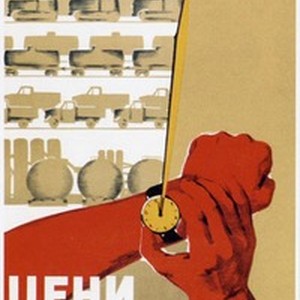 Soviet social poster. Captions read, "Проходит минута неслышно и скоро, страна выпускает продукции горы! Цени рабочую минуту! / Prokhodit minuta neslyshno i skoro, strana vypuskaet produktsii gory! Tseni rabochuiu minutu!", meaning, "A minute is passing quietly and fast, while the country is producing mountains of goods! Value a working minute!". [Description English/roman)]