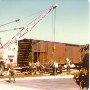 Photo--black and white: P&SR boxcar installation behind West County Museum depot station in Sebastopol for the Western Sonoma County Historical Society. The Frizelle Enos building is seen in the background.