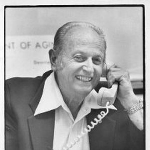 Kenneth Hill at his desk (for story about people over 65 still working). Department of Aging sign visible in background.