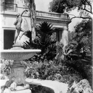 Bacchante bronze fountain by Frederick MacMonnies at the entrance to the Huntington residence, north of the loggia, also showing rockery and cycads. MS notes read "HEH residence: fountain and rockery, c. 1920" and "Fountain and portico about 1920."